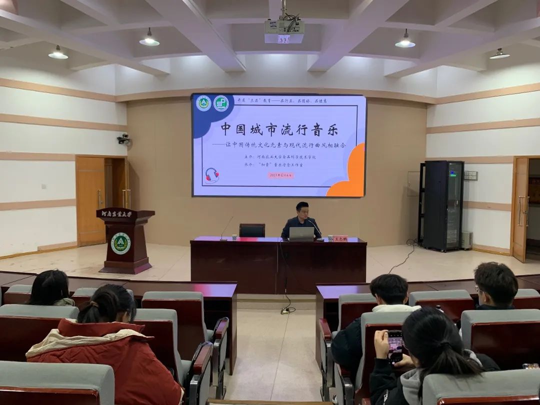 于文化路校区三百人报告厅举行“中国城市流行音乐”讲座,此次会议由“知音”音乐疗愈工作室承办,河南职业技术学院教授王志鹏担任主讲,博士辅导员补彤出席会议,亚洲色吧