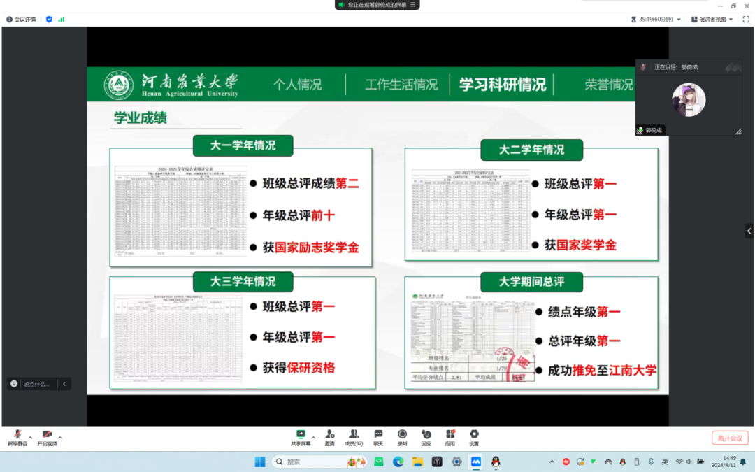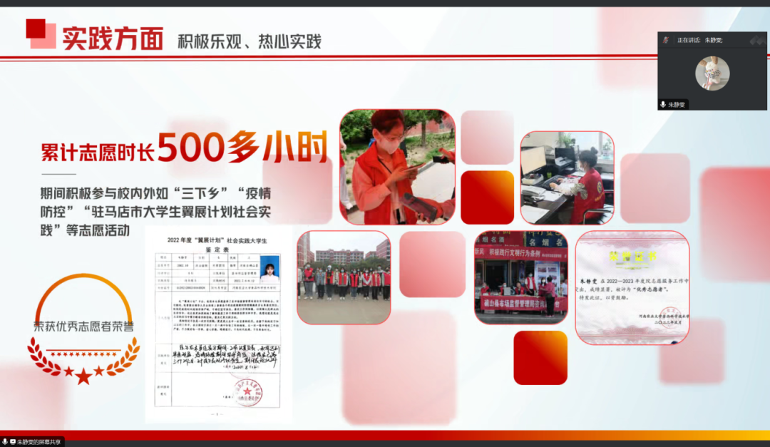 会议伊始,张金龙向参评同学和评委宣读了评选要求及评选规则,22位参评同学依次进行自我介绍,他们分别从思想、学习、生活和工作等各方面对自己即将结束的大学生活做出总结,并展示了大学以来所获荣誉和学业成绩,不论是选择就业还是继续深造,他们对自身都有清晰明确的规划,得到了评委老师们的认可。