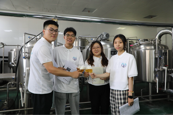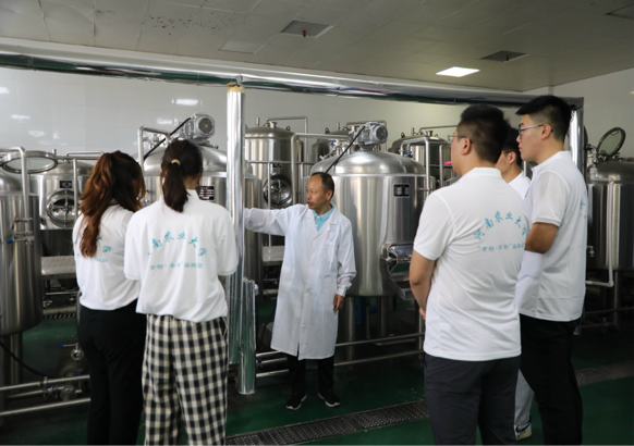 在实验室负责人的带领下,团队成员参观了各种啤酒酿制的设备,了解各个设备的具体用处以及操作注意事项。同时,负责人详细讲解了酿造的原理和啤酒从原料选择、麦芽制备、糖化、发酵的过程。面对专业的仪器和设备,团队成员不时惊叹并提出问题和疑惑,实验室负责人一一耐心解答。在负责人的引导下,团队成员通过亲手操作仪器,更直观地体验到啤酒酿造的全过程,并品尝了不同风味的啤酒。