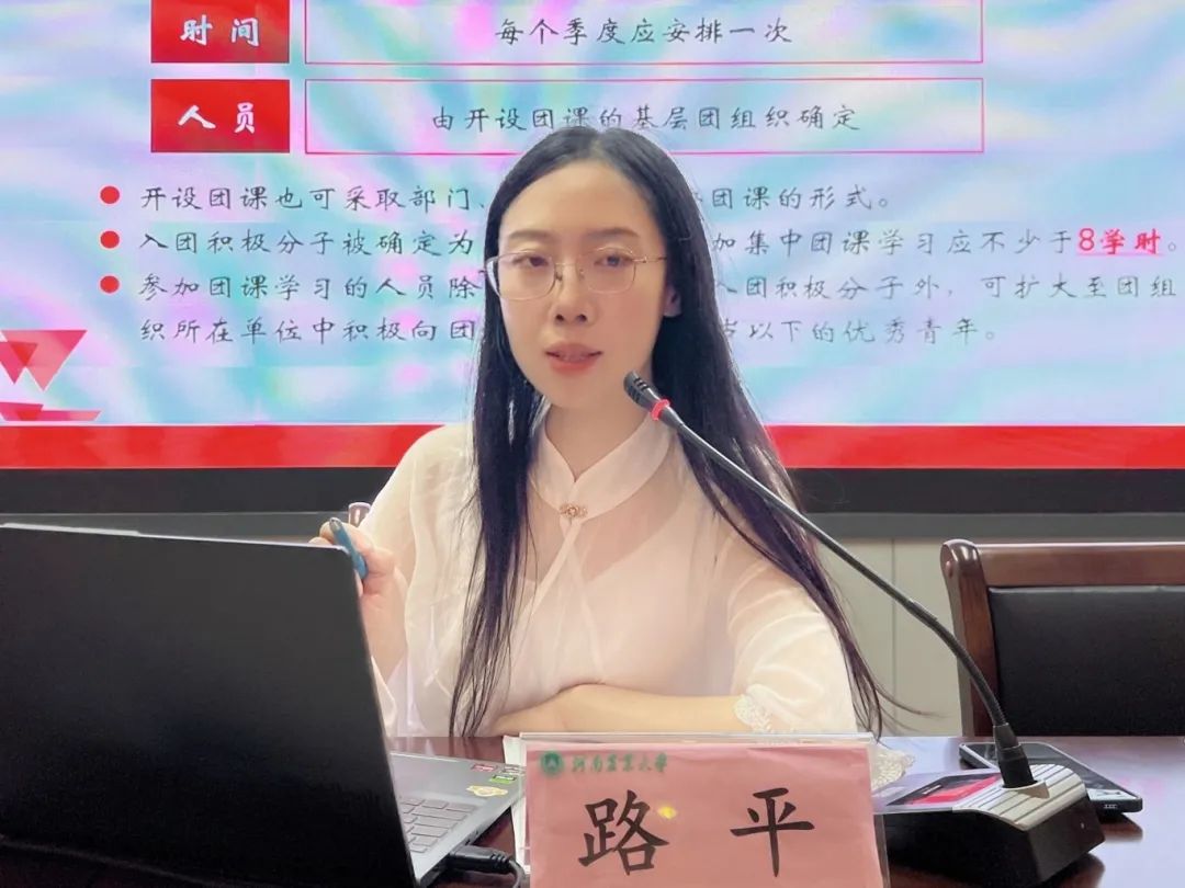 青春正当时,“团团”有力量。路平以“何为青年”引入此次团课主题,她从历史渊源、传统文化等方面阐述了青年的内涵。她强调,青年要牢记习近平总书记给共青团提出的四点希望,坚定不移跟党走。她向同学们详细地讲述了共青团的性质、基本职能、团的组织生活等内容。