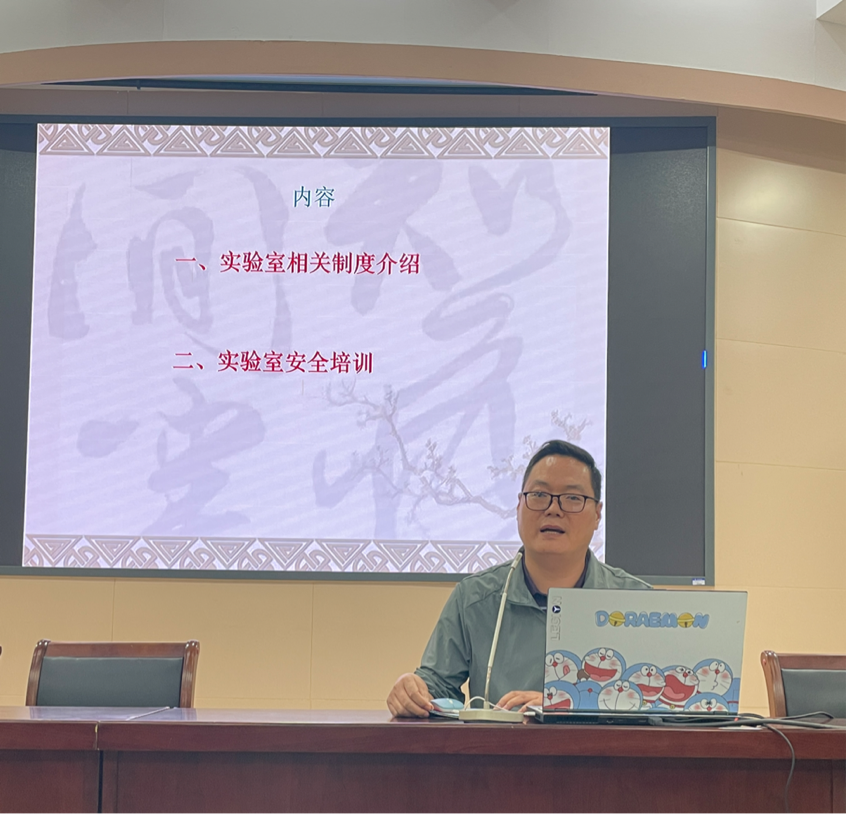 中心实验室乔明武以“研究生实验室安全教育”为主题,发表讲话。他详细介绍了实验室的基本情况、实验室工作守则、实验室仪器设备等相关内容,并重点讲述了实验室安全的重要性,提出“安全意识是实验室的死穴”,并告诉同学们要养成良好的习惯,遵守实验室规则,告诫同学们在实验中,不要懒惰!