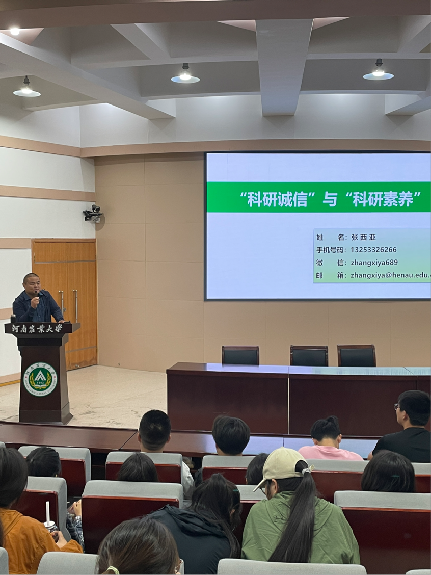 研究生导师代表张西亚开展“科研诚信”讲座。主要介绍了科研诚信与学术规范的概念,科研失信的行为表现和学位论文作假行为处理办法。教育和引导广大研究生形成求真务实,形成诚信严谨的学习风气。