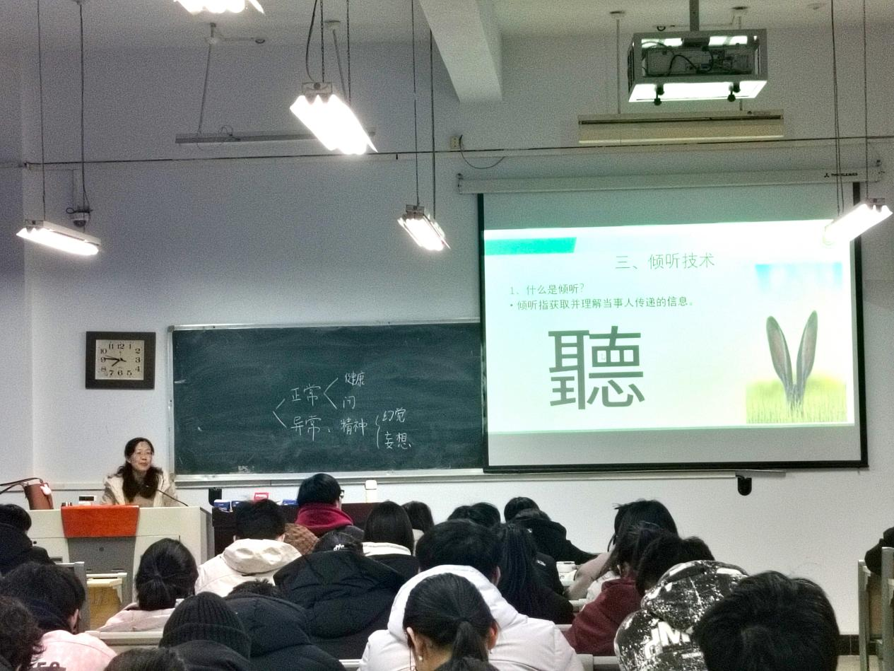 会议伊始,常丽老师通过“橡皮筋练习”小游戏增强互动感,拉近同学们之间的距离,营造了一个开放包容的交流氛围,并由此引发同学们对“领导者”与“跟随者”两者关系的思考。她以“心理委员的定位”、“工作遵循的原则”、“倾听技术”及“情感共情”四个方面为核心,深入浅出地讲解了如何做好同学们的知心朋友、观察员、宣传员及朋辈心理咨询员,着重强调了真诚待人、换位思考的重要性,通过案例示范,提出运用“反应式倾听”明晰求助者的肢体语言,做到有效沟通,为心理委员解决好班级问题提供了新思路、新方法。