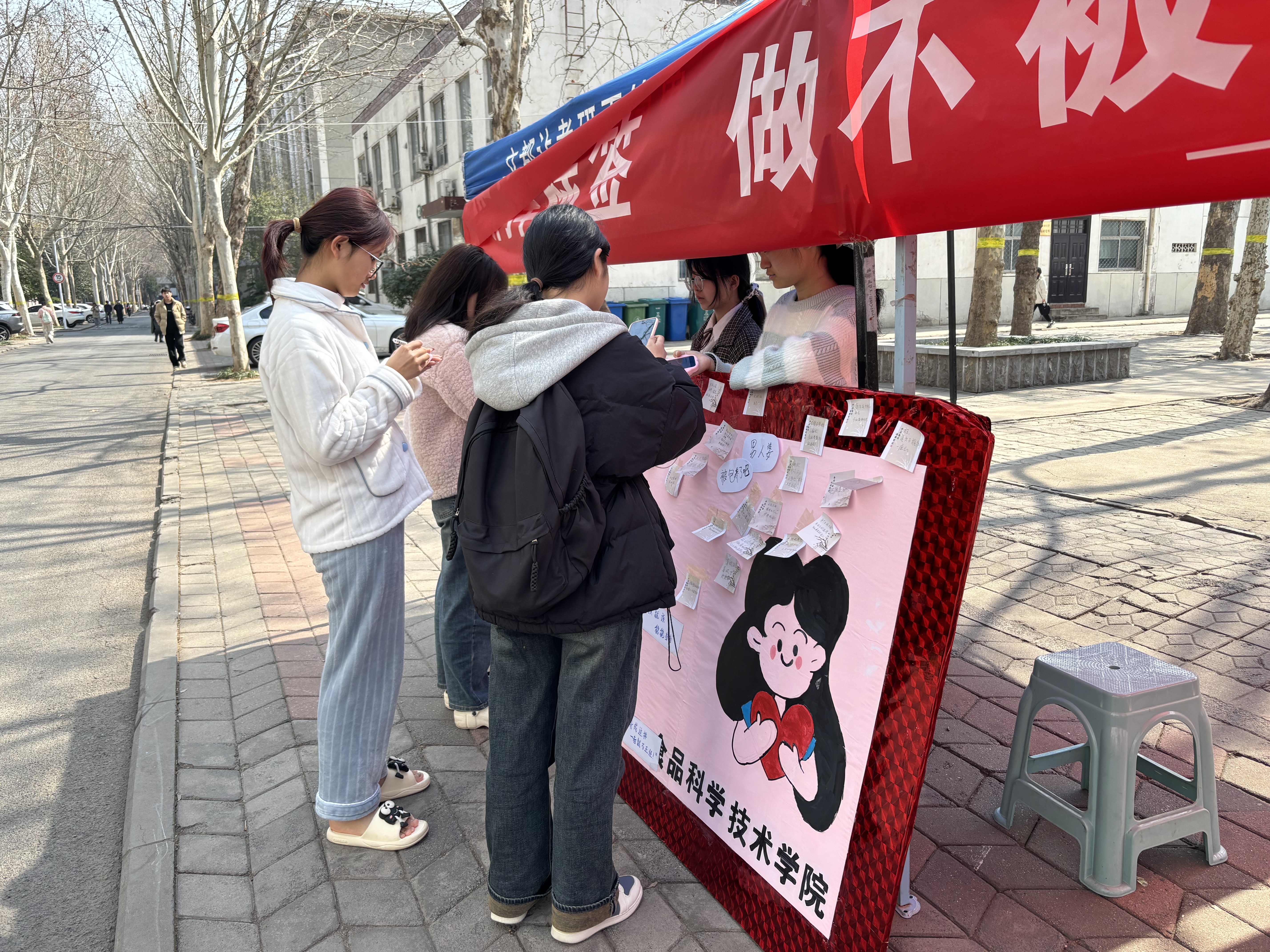 3月8日,同学们纷纷在“素笺逸梦,她自成章”展板前驻足,亲手撕下那些强加在女性身上的刻板印象和不良标签,并在便签上写下对女性的美好祝愿。“独立自信”、“勇敢追梦”、“活出自我”……一张张便签承载着同学们对女性最真挚的祝福,也展现了新时代女性自信、自立、自强的精神风貌。当然,参与活动的同学们也都收获满满,香囊、古风书签、小挂件等精美礼品让大家爱不释手,脸上洋溢着喜悦的笑容。
