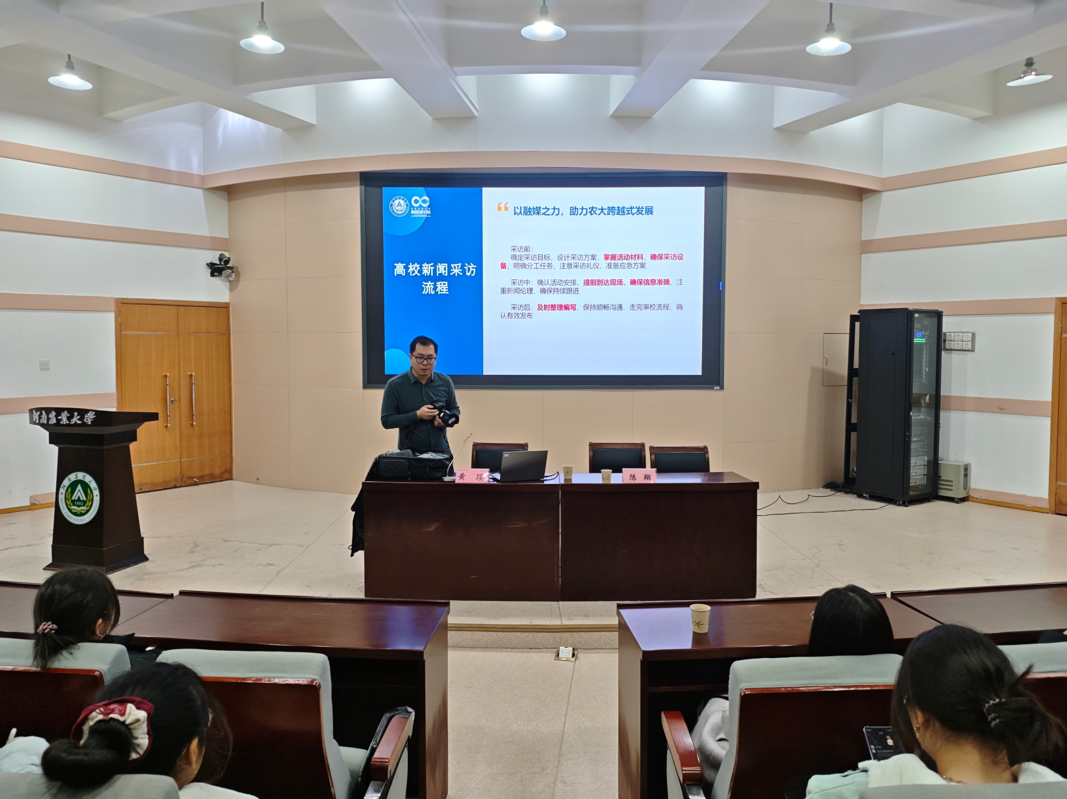 黄璞以《以融媒之力,讲好农大故事》为题,结合自身丰富工作经历与现场师生亲切交流。他从高校新闻采访、稿件撰写及摄影技巧三大维度,系统讲解新闻写作与摄影核心知识,通过剖析我校多则真实新闻案例,让与会师生直观掌握引人注目的标题拟定、清晰严谨的结构搭建、精彩瞬间的捕捉技巧,以及新媒体平台高效传播的方法路径。他还激励大家在今后工作中善用网络新媒体力量,积极传播正能量,为学院各项工作增光添彩。