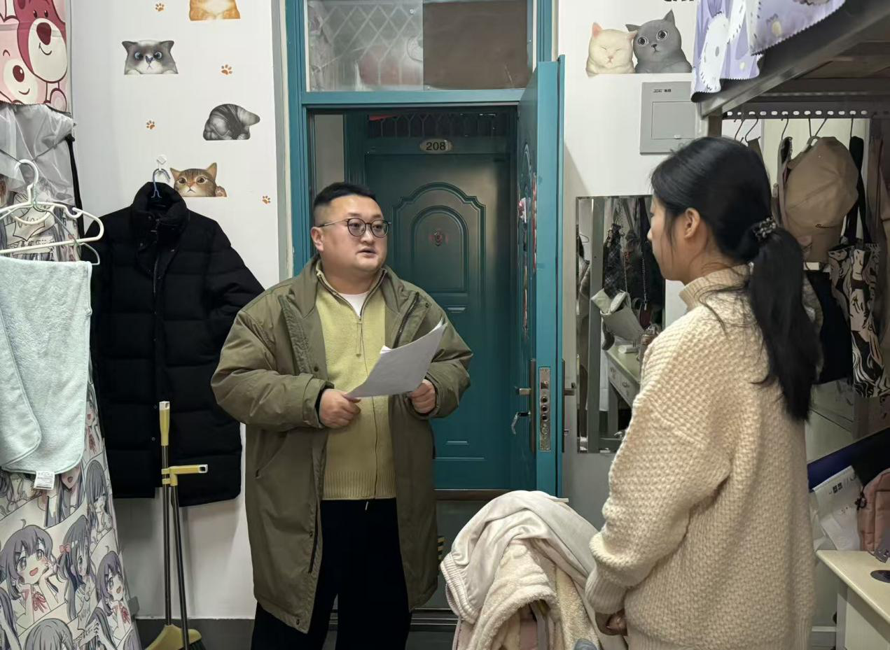 12月9日至12日,院团委书记路平、党委组织员陈翔、团委副书记张金龙、辅导员喻颢如、张泽群、银峰深入各年级宿舍,开展“安全无死角、卫生全覆盖”的双重排查。在排查中,老师们针对上次发现的问题,查看同学们的整改情况,并强调宿舍严禁使用违规大功率电器和食品垃圾要及时清理,引导大家养成整洁、健康的生活习惯。排查期间,老师们格外关注考研学生和四六级考生的备考状态与生活需求,详细询问复习进度、冬季供暖适配情况,叮嘱大家合理安排作息、劳逸结合;对于全体同学期末备考,老师们给出针对性建议,提醒大家要制定科学复习计划,同时着重强调要诚信考试,引导大家树立诚信应考意识,守住学业底线。此外,老师们还主动倾听同学们备考期间的心理压力与生活困难,耐心开展考前心理疏导,缓解焦虑情绪,让严格排查与暖心关怀同步传递,助力同学们轻装上阵迎战考试。