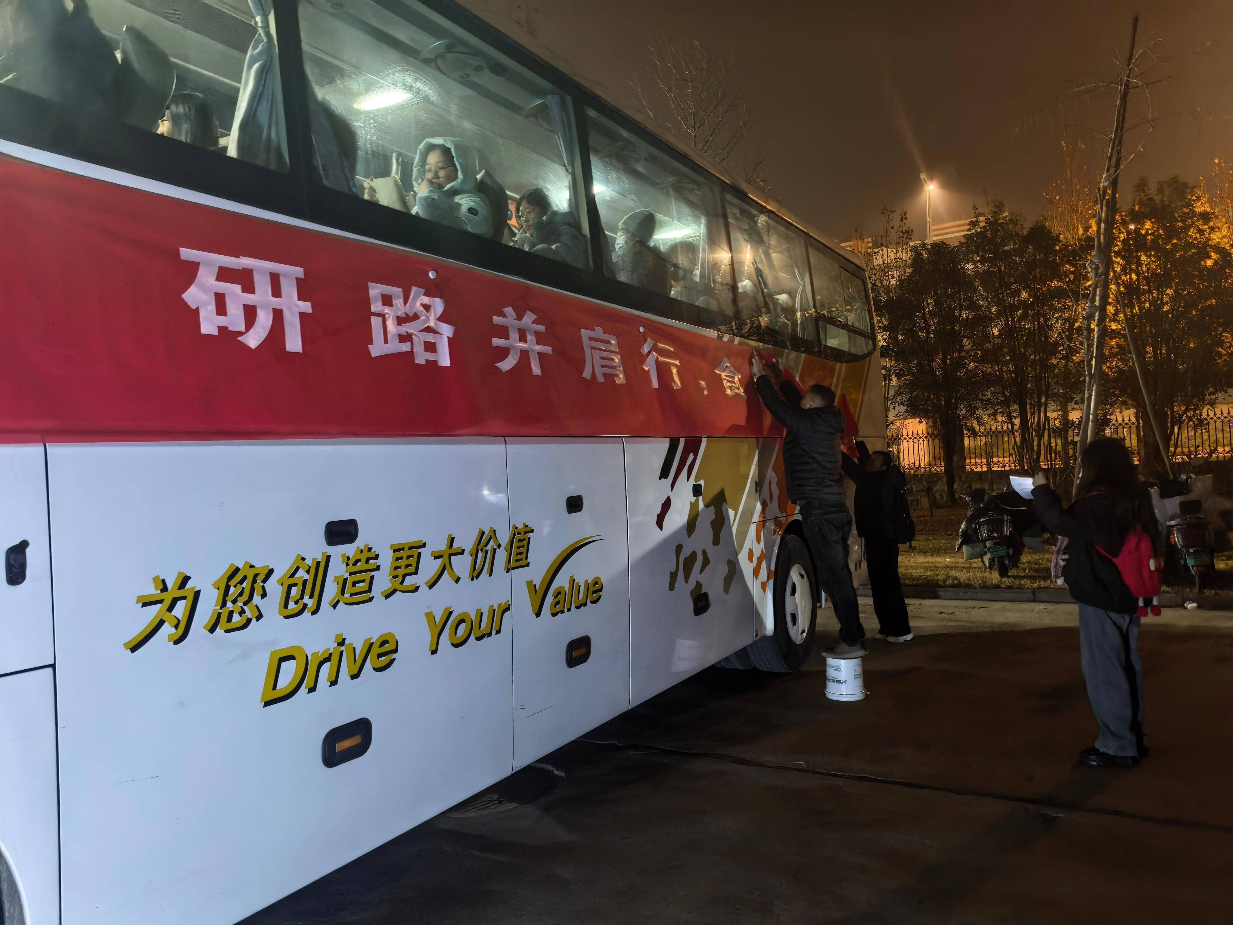 考生前往考点。本次送考分设1号、2号两辆保障车辆,每日将由专人负责车辆信息核对、考生考勤统计及考试物资分发;同步安排专人对接未按时集合的考生,确保人员全流程可控;此外,每车均配备医疗应急物资及保暖用品(如暖壶等),由指定工作人员统一运送、按需提供,全方位覆盖考生的出行与临场需求。