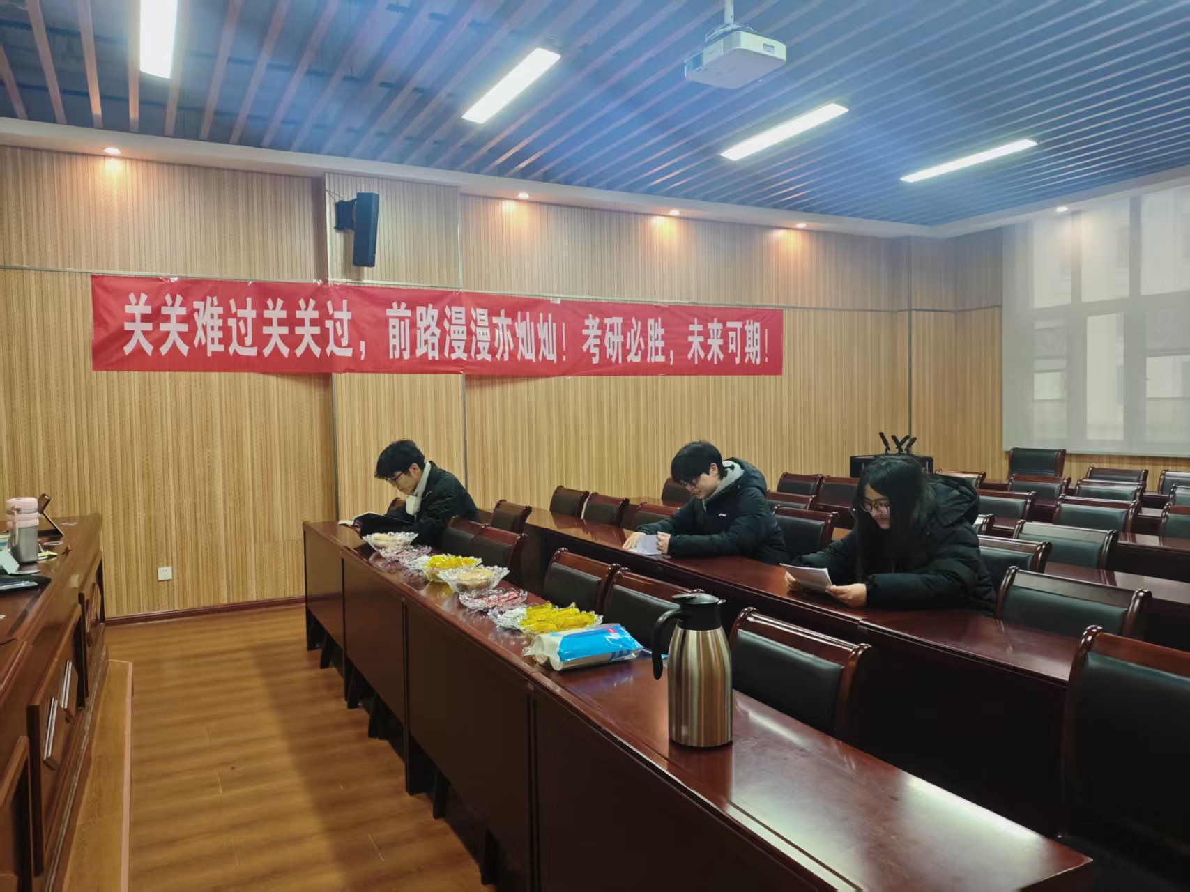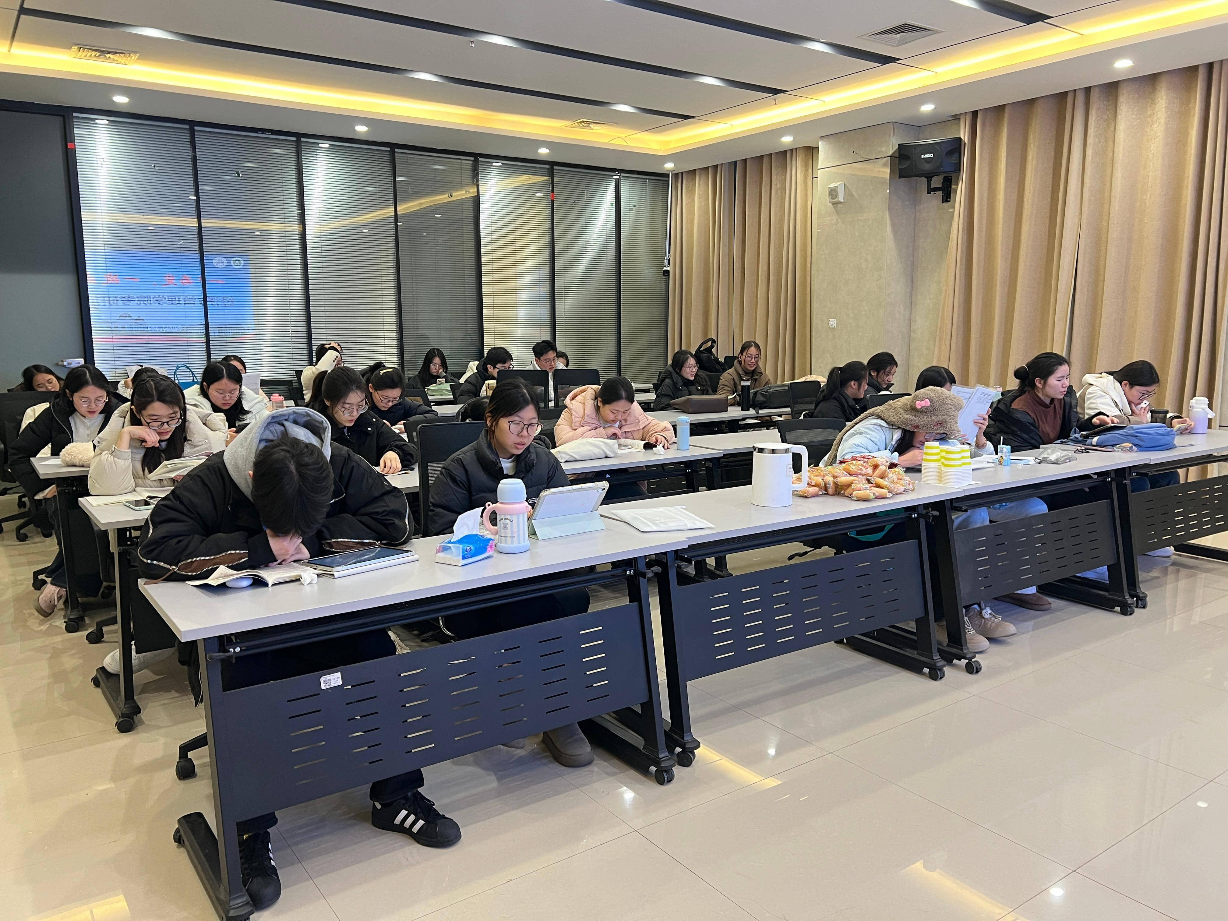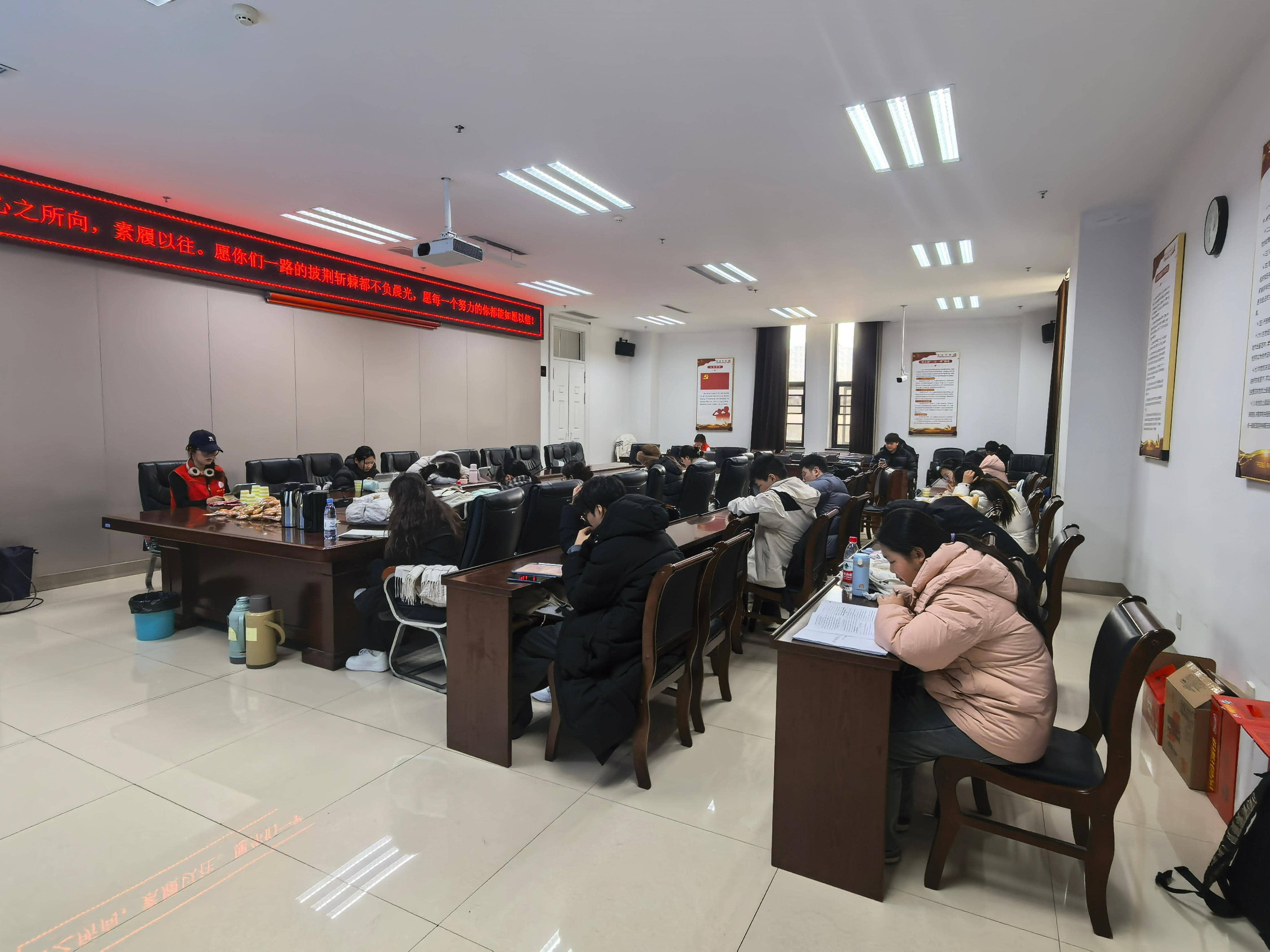 同学们在休息室或养精蓄锐,或专心复习,或与其他考生交流答题经验。志愿者们在休息室穿梭,为考研学子倒一杯热水、拿一个面包、送上一句衷心祝愿,他们用实际行动向每一位考生传递着温暖和力量。