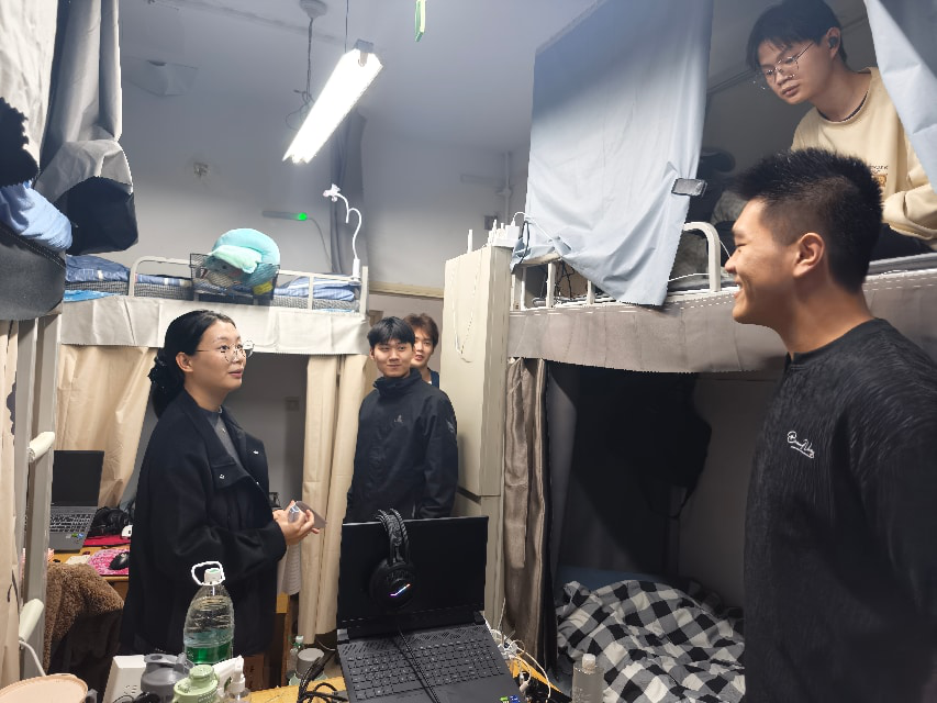 走访中,老师们围绕反诈防骗、消防用电、财产安全等重点领域进行检查提醒。针对大功率电器、私拉电线、楼道杂物堆积等情况现场提出整改意见,叮嘱同学们增强安全意识;结合近期高发诈骗案例,提醒大家警惕陌生信息,保护好个人信息与财产安全。同时,温馨提醒离宿时锁好门窗,妥善保管贵重物品。