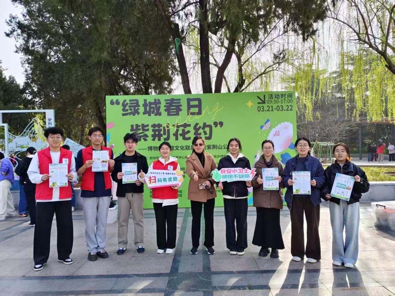 张秋会教授,于3月21日带领2026河南省科学技术协会i科普项目团队教师和“食安强国”社会实践团队的同学们,走进紫荆山公园,开展以“食安守护·健康同行”为主题的社会实践活动,为市民广泛普及食品安全知识,凝聚共识,激活社会共治能力,切实提升公众健康素养。