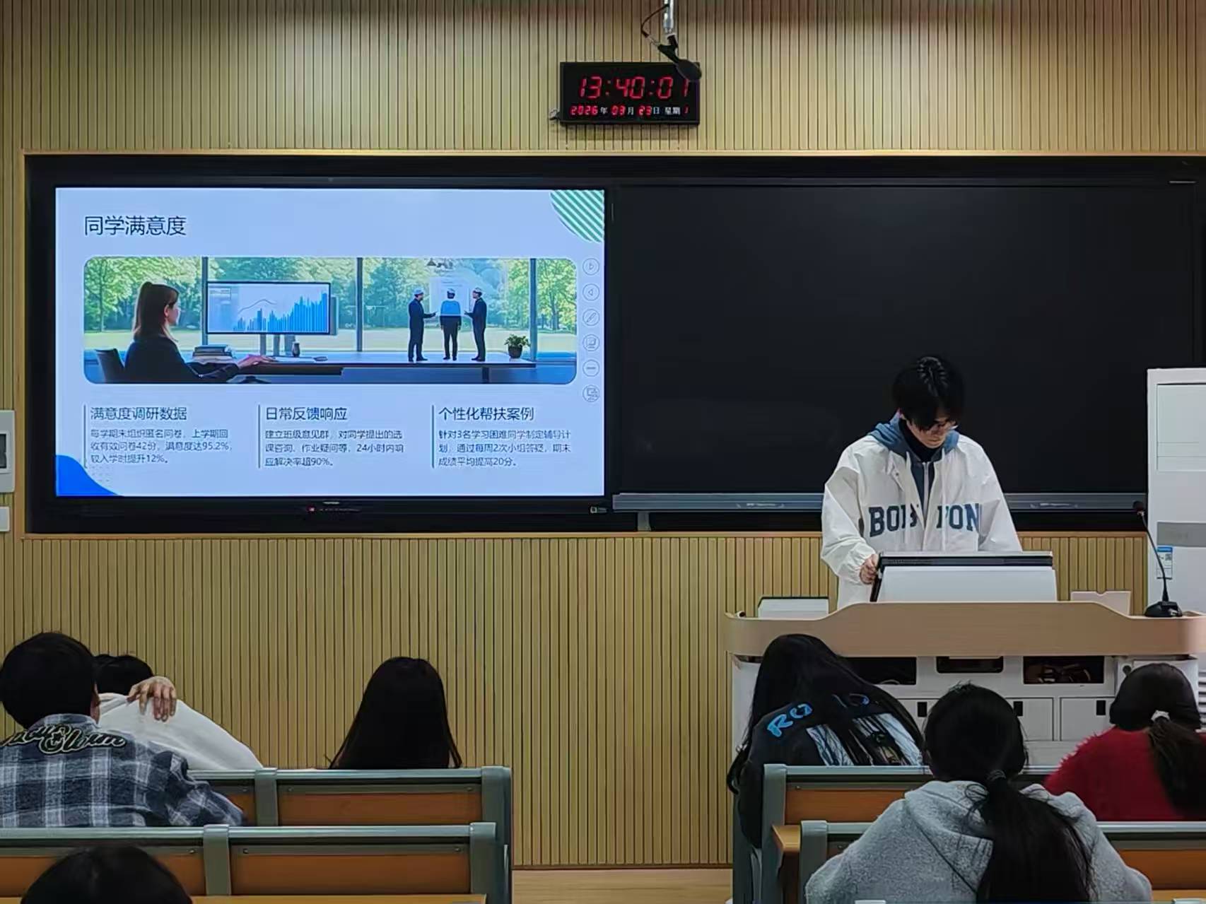 评选现场,各班学习委员通过PPT展示班级在课堂考勤、学业互助、竞赛科研、荣誉积累等方面的扎实成果,分享了在协调师生沟通、组织学习活动、帮扶基础薄弱同学等工作中的实践经验与成长感悟,展现了新时代学生干部的责任与担当。
