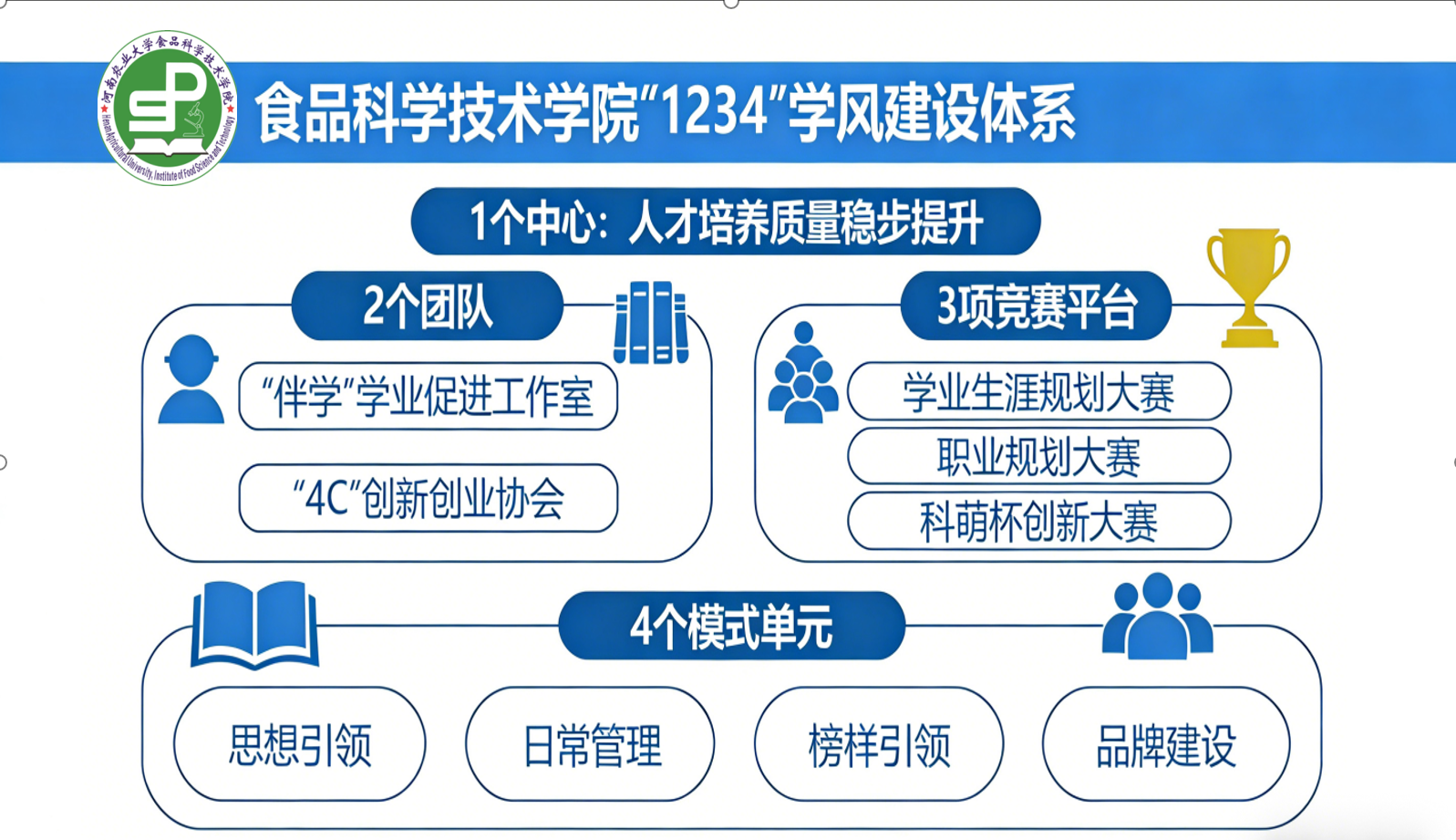 深入学习贯彻习近平总书记关于教育的重要论述,围绕学校“勤学•笃行学风建设活动”总体部署,以“思想引领、日常管理、榜样引领、品牌建设”为思路,着力强化学风建设。通过实施“1234”体系,引导学生明确学习目标、转变学习观念,实现“从要我学到我要学”的根本转变,学生出勤率、就业率稳步上升,旷课率、挂科率、违纪率明显下降,学院连续荣获校学风建设先进单位称号,为培养食品产业卓越工程师奠定坚实基础。
